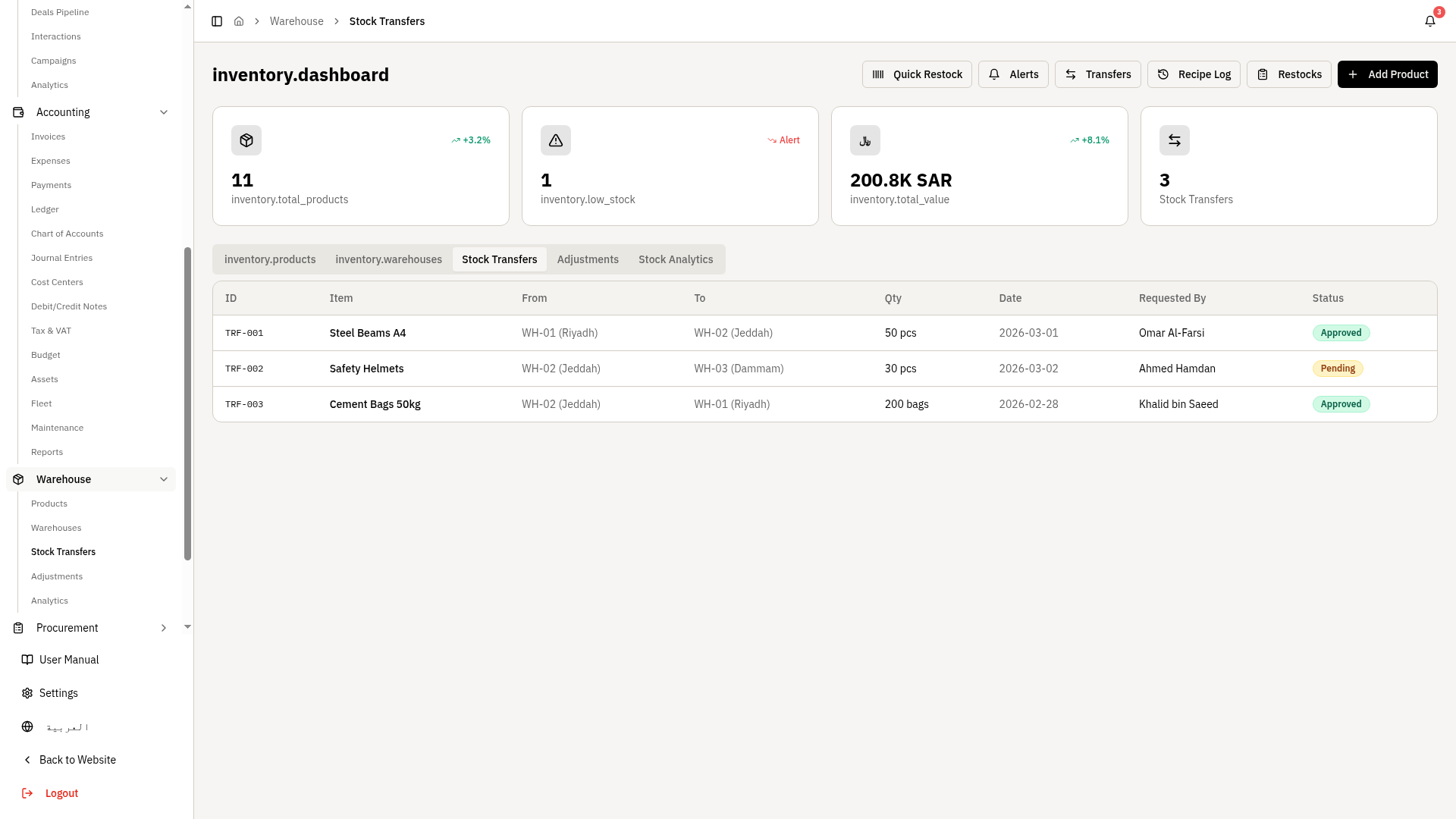 Auto-trigger reorder points and supplier purchase requests.